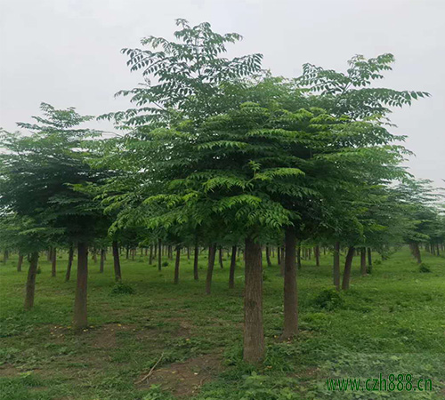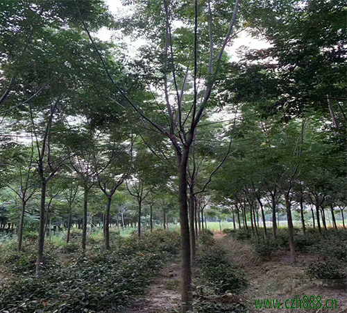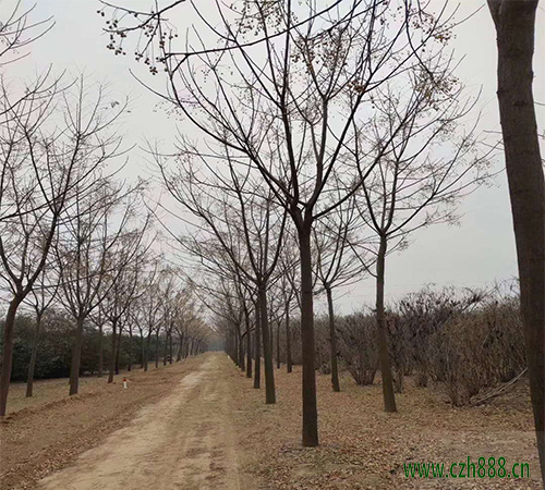大苗培養: 選擇土層深厚、土壤肥沃的育苗地,精耕細作,施足基肥,同時做好土壤的消毒和滅蟲工作。南北方向做床,床面寬1 .5米,每畝定植660株左右。秋季落葉至春季萌芽前,選陰天或無風的清晨及傍晚進行移植。移植時適當修剪主根,以促進側根的生長。移植后做好松土除草、灌溉施肥、病蟲害防治等工作,使根系、枝條盡快恢復生長。經過兩年的培育,當苗木平均高3米左右,胸徑2.5至 3厘米可出圃。