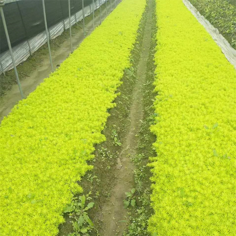 3、分株:春天夏天將金葉佛甲草的莖葉切割成6~7厘米長小段,撒到已耕靶整理平整地面上,用三齒靶在盆土表面輕輕鋤,使莖節呈半掩埋情況注入土壤,隨后噴二遍水,保持土壤濕潤,約一個星期左右即長根。金葉佛甲草的扦插繁殖系數為1:20,即正常生長的1㎡可擴繁20㎡。